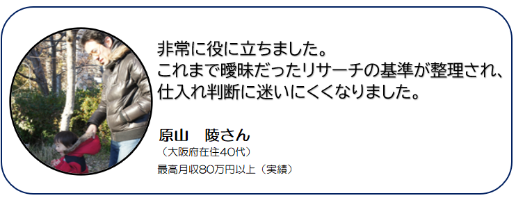 ・失敗しないオークファンの使い方、相場検索の仕方 ・相場検索でよく見かける3つのミス ・仕入れられない!と悩んだ時にやってほしいこと3選 ・【カメラリセール】ヤフオク仕入れ入札の極意! ・カメラのキタムラ ネット中古攻略法 ・ヤフオク仕入れ攻略法 ・ヤフオクセラーリサーチから商品を知る方法 ・オークファンの使い方Ⅱ ・入札予約、スナイプ入札 |